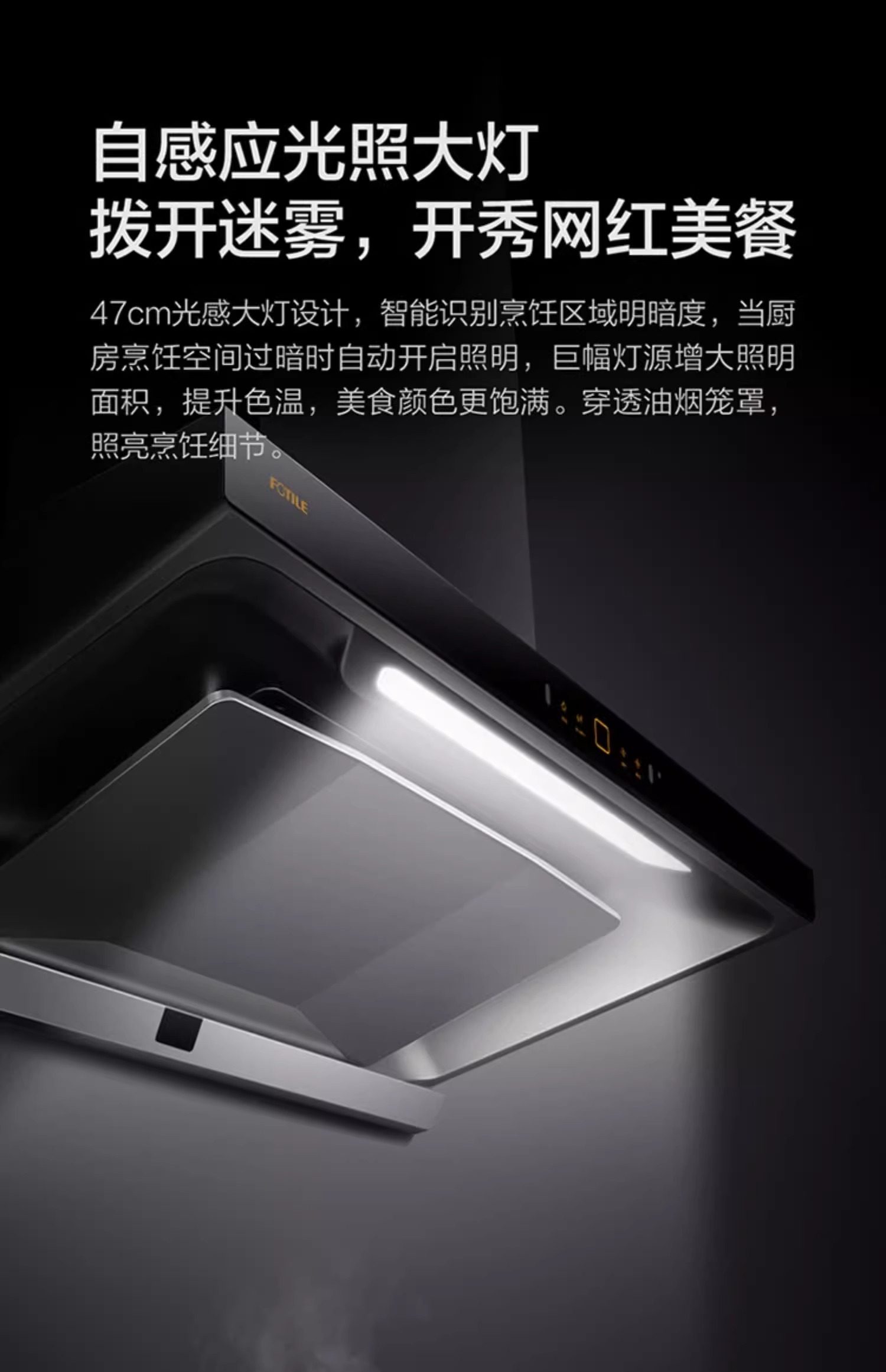 智能联动与安全方面,支持与方太智能燃气灶、洗碗机等设备联动,开启燃气灶时,油烟机自动开启;关闭燃气灶后,油烟机自动延时关闭,确保厨房油烟彻底排出。配备多重安全防护功能,包括过热保护、防漏电保护、防回火保护等,使用更放心。采用简约时尚的外观设计,黑色钢化玻璃面板,易清洁、耐刮花,可轻松融入各种厨房风格。