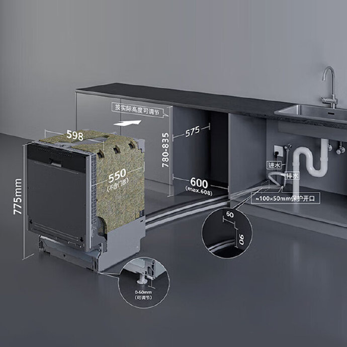 安装设计考虑周全,采用全嵌入式设计,面板可定制以匹配厨房整体风格。内部碗篮可灵活调节,最高可容纳16套标准餐具。能效表现突出,标准洗涤程序每次耗水约9.5升,耗电约0.9度。实际使用数据显示,相比手洗可节水约70%,特别适合注重环保和效率的现代家庭。
