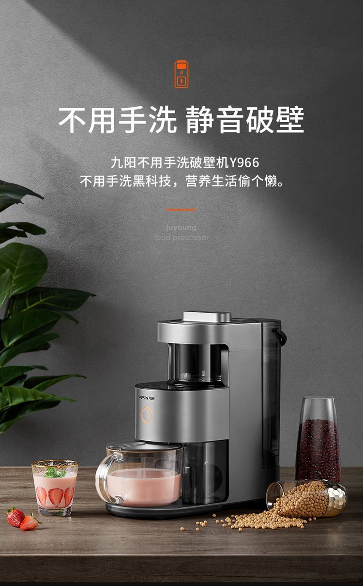智能操控方面,支持九阳智慧厨房APP远程控制,用户可远程启动设备、选择烹饪程序、调节参数,还能获取海量营养食谱,跟随步骤轻松制作。机身配备高清触控屏,操作直观便捷,老人也能轻松上手。具备自动清洗功能,烹饪完成后可自动清洗杯体,减少用户清洁负担。此外,具备防溢、防干烧、过热保护等安全功能,保障使用安全。九阳智能破壁机Y966以强劲破壁和智能便捷,为家庭打造营养健康的饮食体验。