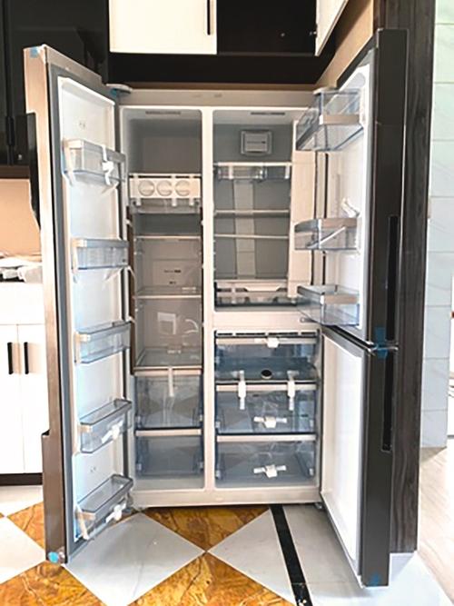 这款冰箱采用一体化嵌入式设计,机身厚度精准适配标准橱柜尺寸,实现与橱柜无缝拼接,无突兀缝隙,搭配暗金色装饰线条与钢化玻璃面板,质感厚重且彰显格调,轻松融入现代简约、轻奢等多种家装风格。容量达608升,分区规划合理,配备独立保鲜抽屉、变温区与冷冻分区,能满足不同食材的存储需求,避免串味与营养流失。