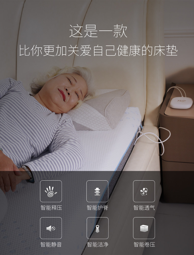 智能赋能升级,覆盖全场景睡眠需求。床垫搭载豪江Richmat四驱电机,升降平稳性较双驱电机提升60%,运行噪音≤35分贝,达到耳语级静谧,夜间调节角度完全不影响枕边人休息,800斤的承重上限也让使用更安心。内置7大固定模式与7+N自定义模式,一键切换打鼾干预、孕妈起身、阅读、瑜伽等场景,其中打鼾干预模式可自动抬高床头15°,实测能减少72%打鼾频率,孕妈起身模式预设45°抬背角度,老人抬腿模式可缓解下肢水肿,精准适配不同人群需求。此外,床垫接入华为鸿蒙、米家、天猫精灵三大智能平台,支持语音与手机APP双操控,可实时监测心率、呼吸、深睡时长,生成日/周/月睡眠报告,还能联动卧室灯光、窗帘,打造从入睡到晨起的全流程智能睡眠场景。