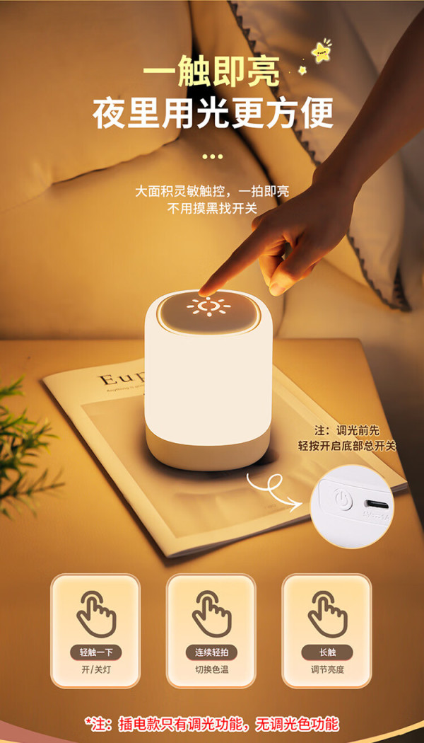 多功能集成设计实用,床头灯底座可拆卸为手机支架,可放置手机、平板,方便睡前观看视频、浏览资讯,无需额外购置手机支架,节省桌面空间。底座侧面隐藏多个USB接口和电源插孔,可同时为手机、平板、耳机等多种电子设备充电,解决卧室充电接口不足的问题,便捷又省心。支持触控控制,轻触灯体即可开启、关闭灯光、切换色温、调节亮度,操作便捷,夜间起夜无需摸索开关,轻触即亮,避免打扰家人休息。