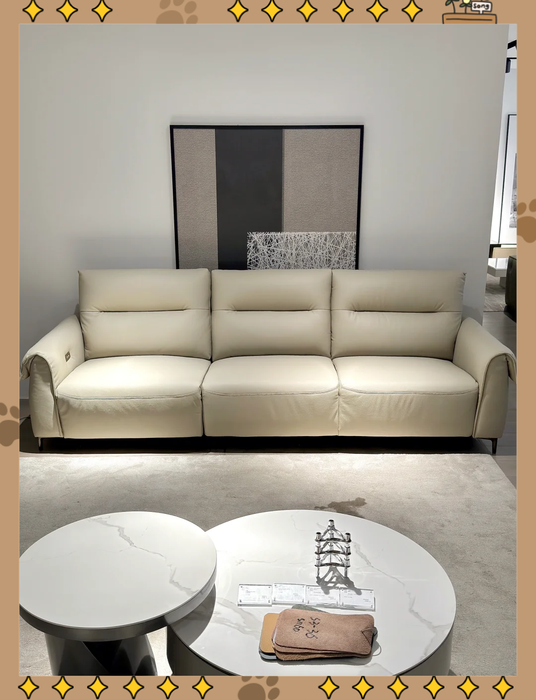 材质与实用性兼顾,细节设计贴心。沙发采用亲肤级科技布材质,防水、防污、耐磨,日常污渍只需用湿抹布轻轻擦拭即可清洁,适合有小孩、宠物的家庭;内部填充高回弹海绵与羽绒混合材质,久坐不塌陷,回弹性出色,既能提供足够的支撑力,又能保证坐感柔软舒适。沙发扶手内置隐藏式USB充电接口,可随时为手机、平板等设备充电,避免客厅电线杂乱的问题;靠背侧面设有隐藏式收纳袋,可存放遥控器、杂志等小物件,保持客厅整洁。