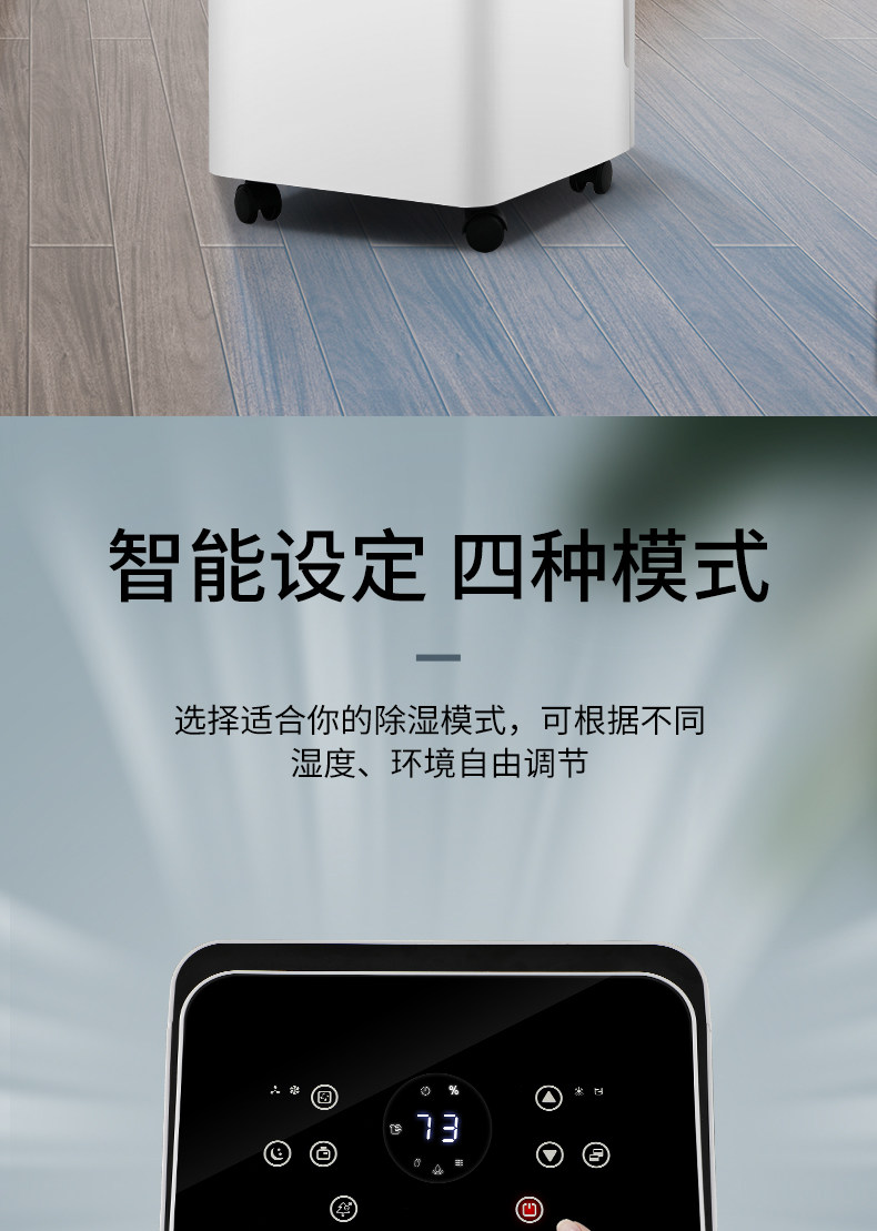 多模式运行,适配多场景除湿需求。支持自动除湿、手动除湿、干衣模式、睡眠模式四种运行模式,用户可根据不同场景的需求,选择合适的运行模式。自动除湿模式,根据室内湿度自动调节除湿力度,适合日常除湿;手动除湿模式,可手动调节除湿力度和风速,适配不同湿度环境;干衣模式,可快速烘干潮湿的衣物,适合梅雨季、阴雨天使用,避免衣物发霉、产生异味;睡眠模式,降低除湿力度和风速,噪音更低,适合夜间使用,兼顾除湿与睡眠舒适。