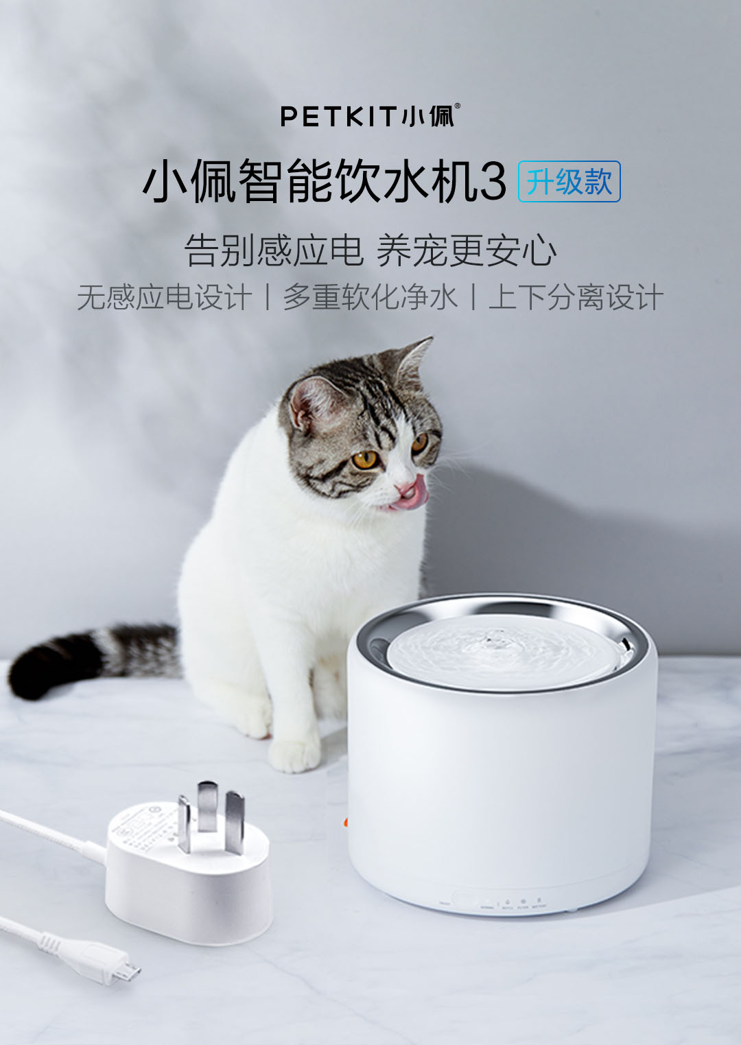 设计贴心,适配多宠物家庭。饮水机采用大容量水箱设计,水箱容量为2.5L,可满足多只宠物的日常饮水需求,无需频繁加水,节省铲屎官时间;水箱采用透明材质,可实时查看水量,避免缺水影响宠物饮水。机身采用防打翻设计,底座加重,避免宠物打翻饮水机,导致水洒漏、设备损坏;同时,机身采用宠物友好型材质,无异味、无有害物质,避免宠物啃咬时受伤,边角圆润,防止宠物划伤。