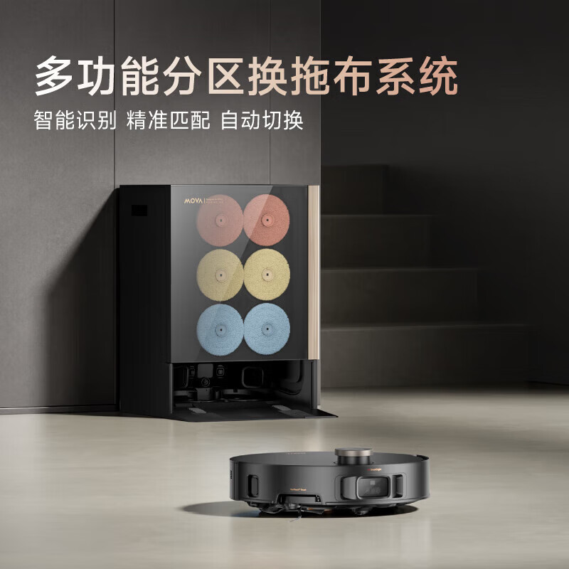核心亮点在于Space Hub自动换拖布系统,清洁精准适配不同场景。Mova V60 MOBIUS搭载专属Space Hub系统,基站内置三组不同功能的拖布,分别为锁温拖布、超净拖布、云绒拖布,机器人可通过视觉识别系统,自动区分地面材质(地砖、地板、大理石等)与脏污程度,然后自动返回基站切换对应拖布,全程无需用户手动干预,15秒即可完成拖布切换,实现“按需上岗”。厨房油污较重,切换锁温拖布,基站会用100℃热水浸泡拖布,保持40℃恒温清洁,轻松去除顽固油渍;客厅地砖易积灰、有缝隙,切换超净拖布,以20N压力加压清洁,可深入缝隙,清除缝隙内的灰尘、污渍;卧室木地板怕刮伤,切换云绒拖布,轻薄柔软,可吸附毛发,避免留下划痕,同时保护地板不受损伤。